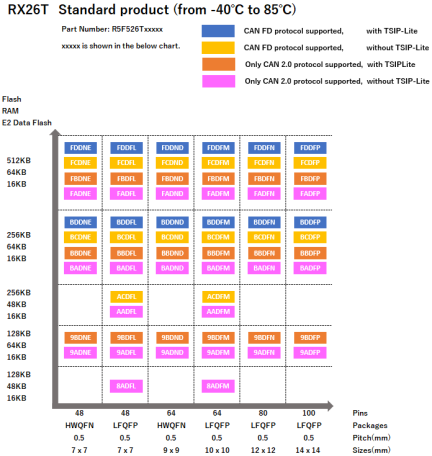 | Security & Encryption | Unique ID, Unique ID, AES, MAC, TRNG, Unique ID, TSIP-Lite:AES(128/256), TSIP-Lite:CMAC, TSIP-Lite:TRNG, TSIP |