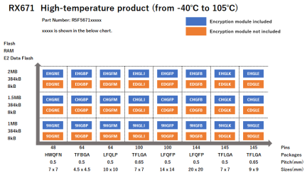 • 120MHz RXv3 core (6.01 CoreMark/MHz*), double-precision FPU, and register bank save function that speeds up interrupt response