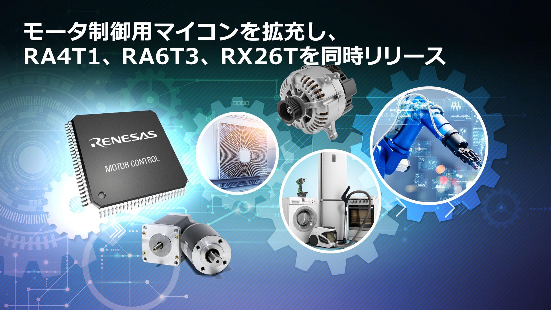 ルネサス エレクトロニクス株式会社(代表取締役社長兼CEO:柴田 英利、以下ルネサス)は、このたび、モータ制御用マイコンのポートフォリオを拡充し、RA、RXファミリを含む3種類の32ビットマイコングループ「RA4T1」、「RA6T3」、「RX26T」を発売、量産を開始しました。メモリやパッケージ展開を含めると35品種以上のマイコン製品が新たに加わりました。ルネサスはこれにより、マイコンやMPU(マイクロプロセッサユニット)、アナログ、パワーマネジメント、センサ、通信デバイス、シグナルコンディショナなど、家電および産業用のモータ制御向け製品ポートフォリオをさらに拡充し、市場をリードします。