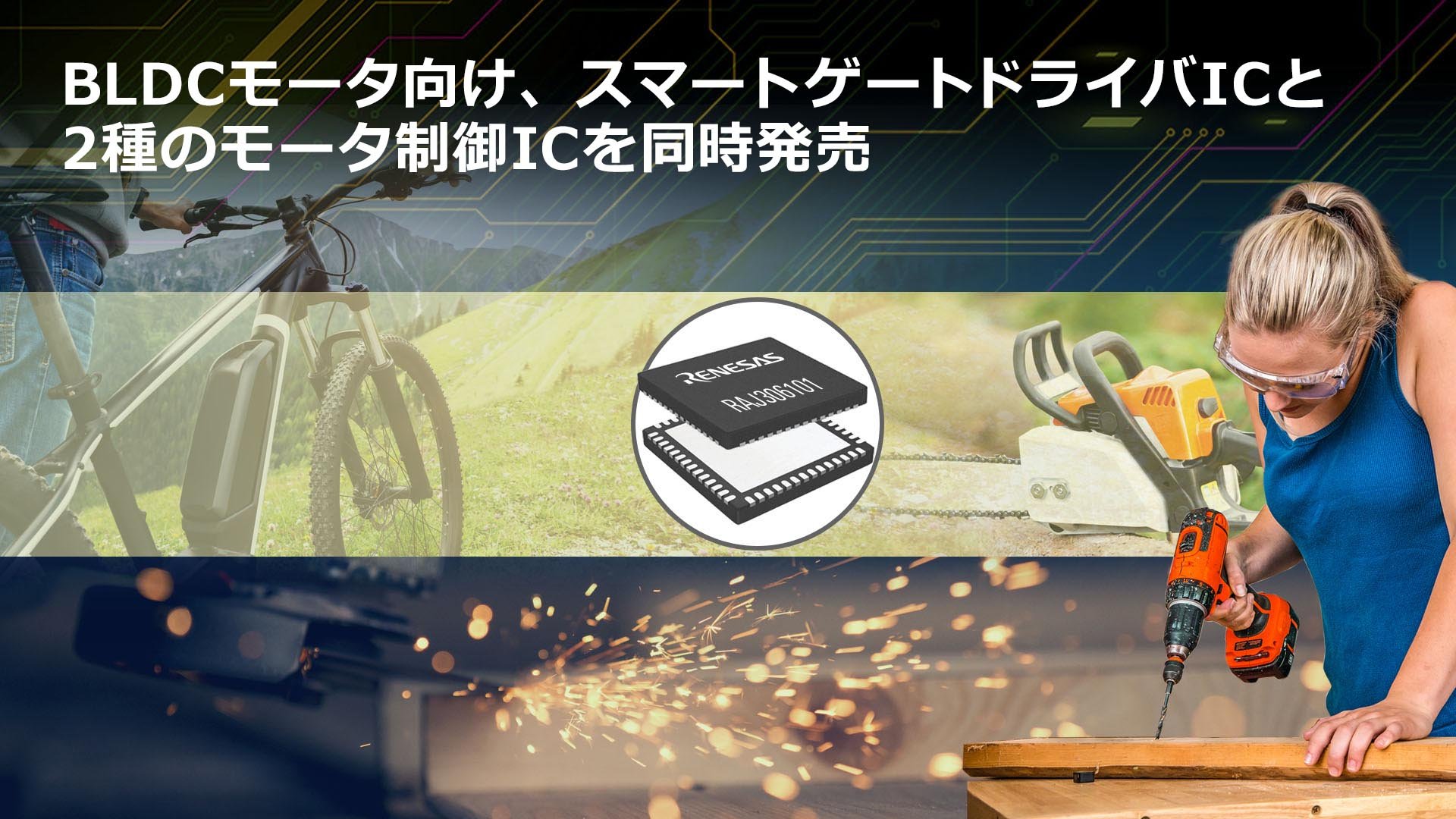ルネサス エレクトロニクス株式会社(代表取締役社長兼CEO: 柴田 英利、以下ルネサス)は、このたび、ブラシレスDC(BLDC)モータ向けに、3相スマートゲートドライバIC「RAA306012」と、マイコンとゲートドライバICを1パッケージに搭載した2種類のモータ制御IC「RAJ306101(RX13T搭載)」「RAJ306102(RL78/G1F搭載)」を発売、量産を開始しました。