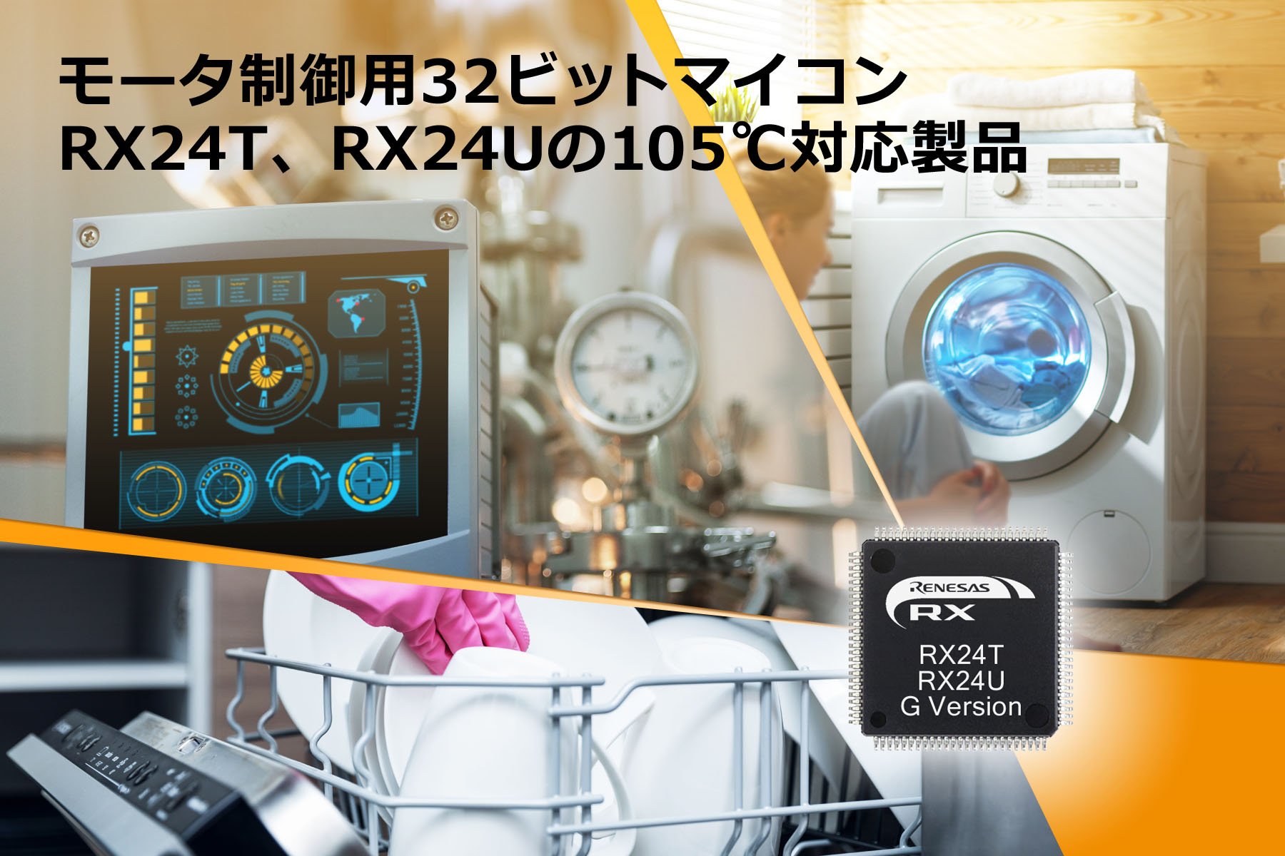 ルネサス エレクトロニクス株式会社(代表取締役社長兼CEO:呉 文精、以下ルネサス)は、このたび、家電、産業機器、OA機器などのモータ制御用32ビットマイコンRX24TグループならびにRX24Uグループに、新たに動作周囲温度がマイナス40℃から105℃と、増加する高温環境下での使用ニーズに対応した「RX24T Gバージョン」、「RX24U Gバージョン」をラインアップし、本日より量産出荷を開始します。産業機器やOA機器をはじめ、熱風や熱湯を扱う家電においても、高温になる箇所に回路基板を配置したいというニーズが増しています。例えば、食器洗い機やIHクッキングヒータなどの家電は、庫内やヒーター面は広げつつ、コンパクトに設計されることが求められており、回路基板を設置するスペースは制約される一方です。さらに、こうしたスペースの制約により基板自体の面積も縮小される傾向にあり、結果として基板の放熱性が下がることになり、基板そのものが高温になる場合もあります。こうした課題に応えるため、高温スペースや高温な基板上でも動作可能な高温対応品を、新たにラインアップしました。これにより、高温環境下でも柔軟な機器設計が可能になり、さらなる小型化を進めることが可能になります。