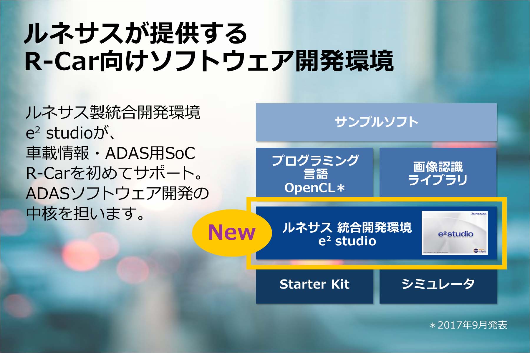 ルネサス エレクトロニクス株式会社(代表取締役社長兼CEO:呉 文精、以下ルネサス)はこのたび、ソフトウェア統合開発環境「e 2 studio」を車載情報・ADAS(Advanced Driver Assistance Systems:先進運転支援システム)用SoC「 R-Car V3M」に拡充し、2018年第1四半期より提供を開始することにいたしました。