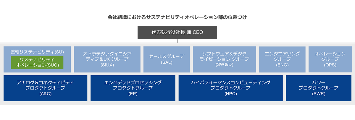 ルネサスは、環境基本理念、環境管理基本規則を経営基本規則に定めています。関連会社を含めた拠点ごとに環境マネジメントシステムを構築して、環境活動を推進しています。拠点の環境活動のとりまとめは、サステナビリティ・オペレーション部が担当しています。環境活動における各種実績、課題、問題については、サステナビリティ・オペレーション部が、経営者が任命する環境統括責任者へ報告・提案を行います。