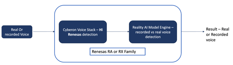 ルネサスの音声なりすまし防止は、高い精度を維持しながら速度と応答性を実現するように設計されており、完全にエッジで行われます。RA ファミリ (RA6、RA4、RA2シリーズ) および RX ファミリのハードウェアに、 Cyberon DSpotter の音声スタックと組み合わせてトリガー/ウェイクワードを識別し、Reality AIによる 生成モデルを使用して、実際の音声と録音された音声を信号内でチェックします。
