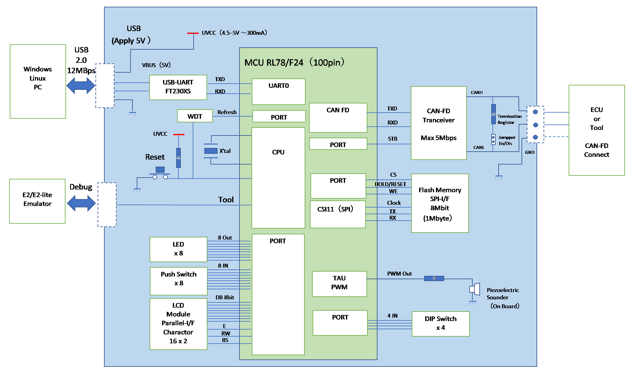 図4にSecurity RSSK ver.2のブロック図案を示します。I/Fとして、CAN FD/CAN、デバッグ、USB、出力/表示にLCD、スピーカ、LEDを用意します。Flash MemoryはリプログラミングやNDA締結前ユーザのプログラム格納領域として使用します。