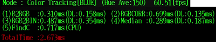 The reason why the robotic arm in the video can recognize and grasp the target object so flexibly is that the unique DRP module integrated into the RZ/A2M accelerates the image processing process of machine vision. We can see on the external monitor that the entire image processing process (including Bayer to RGB, shadow correction and white balance, RGB to binary image, contour search, image noise reduction, Bayer to grayscale sending display, etc.) only takes less than 3ms and achieved the excellent performance of 60fps under VGA (640x480) resolution.