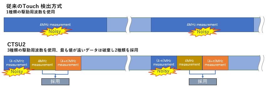 CTSU2の大きな特長は、各タッチチャネル毎に複数種類の駆動周波数を用い計測することで、ノイズ耐性を飛躍的に向上させたことです。従来のルネサスのタッチセンシング方式では、タッチchannel 計測時は1種類の駆動周波数のみを利用していました。この手法では駆動周波数にノイズが同期した場合、センシング時に感度低下や誤検出の懸念がありました。CTSU2 ではchannel 毎に中心周波数を設定した後、それより高周波と低周波の駆動周波数が自動的に設定される仕組みになっています。合計3種類の駆動周波数によって同時計測されたデータから、CTSU2は最も値が遠いデータを破棄し、残りの2つのデータをタッチのON/OFF 判定用に採用します。