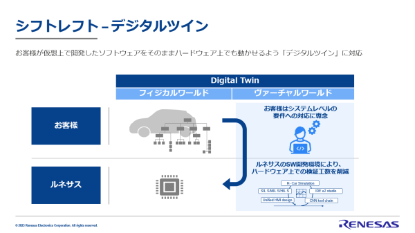 2つ目はデジタルツインによるシフトレフトです。デジタルツインとは、物理空間にある情報を使い、仮想空間に全く同じ環境をあたかも双子のように再現する技術のことです。このようなデジタルツインを利用することで、より速く、より敏捷で、より革新的な開発を、物理世界に移植する前に、仮想空間で行うことができます。ルネサスではこの技術を半導体デバイスに適用し、コンピュータ上で実デバイスと同じ動作をする環境を構築しました。これにより、お客様は物理的なデバイスが利用可能になる前にソフトウェア開発を開始することができ、また地理的な制約や台数などのハードウェアの制約を受けずに開発者の数を増やすことができ、車両全体の開発期間の短縮に貢献することができます。