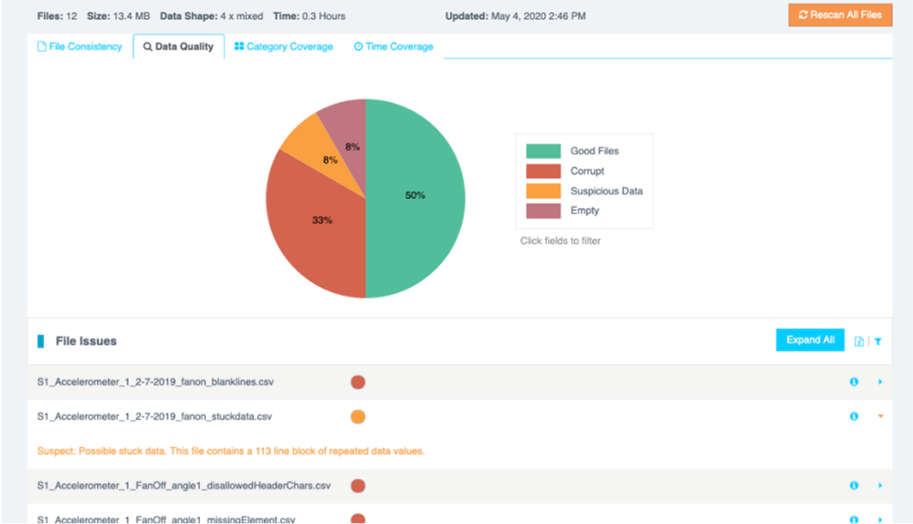 Every time a new source data file is added to a project in Reality AI Tools, the system reads the file, parses it, and looks for issues. If any are found, they generate immediate user alerts. The system also generates statistics that can be used to identify trends and report on progress.