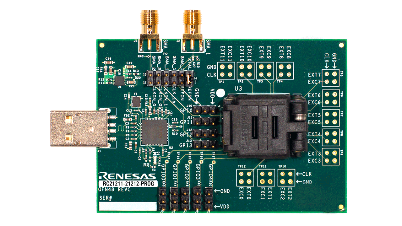 AutoClockプログラミングボードは、 RC21211 および RC21212 プログラマブルクロックジェネレータブランクデバイスのプログラミングを容易にします。 オンボードUSBインターフェースにより、 Renesas Integrated Circuit Toolbox (RICBox™) GUIソフトウェアを使用して、ソケット内のブランクデバイスと通信し、設定とプログラミングを行うことができます。