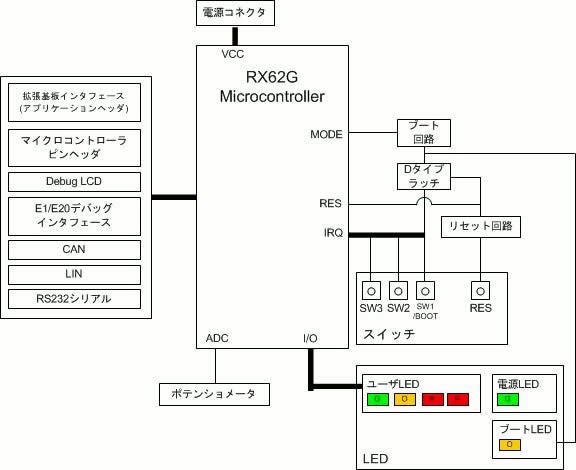 - Renesas Starter Kit for RX62Gの目的は、製品購入後すぐにプログラムを実行できる簡単なプラットフォームを提供することにより、お客様がマイコンや周辺機能を学習/評価できるようにすることです。