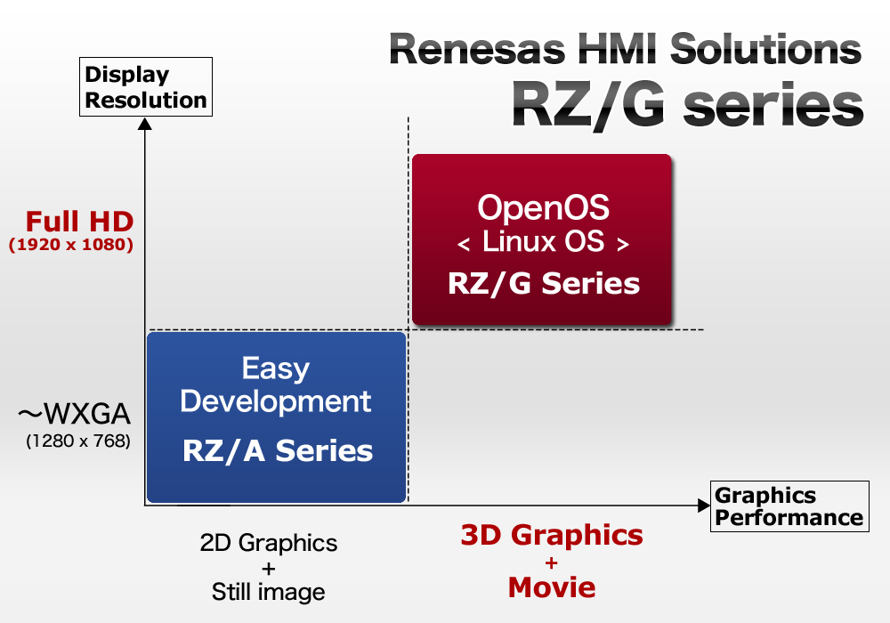 そこでルネサスは、こうした複雑な機能をできるだけ簡単に安心して開発していただくため、新しいHMIソリューション「RZ/Gシリーズ」を製品化いたしました。新製品は、2Dグラフィックス、WXGAのHMIソリューションを実現する「RZ/Aシリーズ」の上位モデルとして、マルチメディア、グラフィックス機能、CPUを強化したHMIのASSPとして ラインアップします。