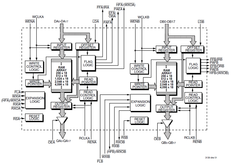 The 72845 is a 4K x 18 First-In, First-Out memory with clocked read and write controls. It is functionally equivalent to two 72245 FIFOs in a single package with all associated control, data, and flag lines assigned to independent pins and would be applicable for a wide variety of data buffering needs, such as optical disk controllers, Local Area Networks (LANs), and interprocessor communication. Each of the two FIFOs has an 18-bit input and output port. The Read Clock can be tied to the Write Clock for single clock operation or the two clocks can run asynchronous of one another for dual-clock operation.