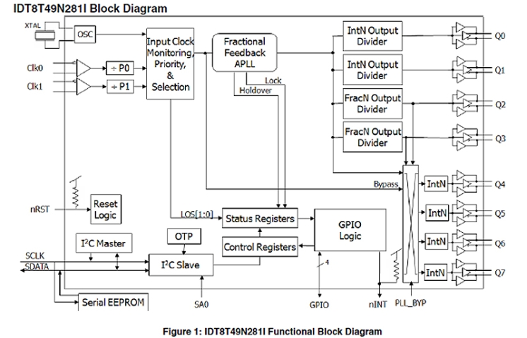 The 8T49N281i has one fractional-feedback PLL that can be used as a jitter attenuator or frequency translator. It is equipped with six integer and two fractional output dividers, allowing the generation of up to eight different output frequencies, ranging from 8kHz to 1GHz. Three of these frequencies are completely independent of each other and the inputs. The other five are related frequencies. The eight outputs may select among LVPECL, LVDS, or LVCMOS output levels.