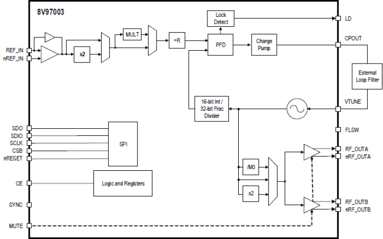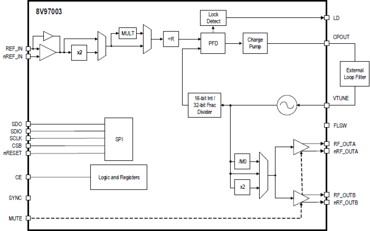 - は最大500MHz(整数倍モード)または250MHz(フラクショナルモード)で動作可能の位相周波数検出器(PFD)