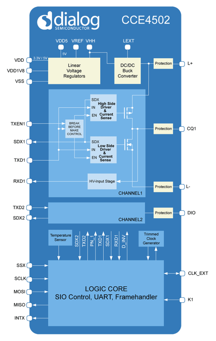 The CCE4502 is a highly integrated device-side IO-Link compliant transceiver IC. The built-in hardware-based IO-Link frame handler provides full IO-Link protocol handling facilities making it simple to connect a host microcontroller via the UART interface. The comprehensive function set includes LDOs and step-down DC/DC converter, on-chip oscillators and a user SPI interface for configuration and read back of fault indicators. The output stage provides overcurrent, reverse polarity and thermal protection and is tolerant to ±40V input. It is configurable as push-pull, open drain (PMOS or NMOS) or input only.