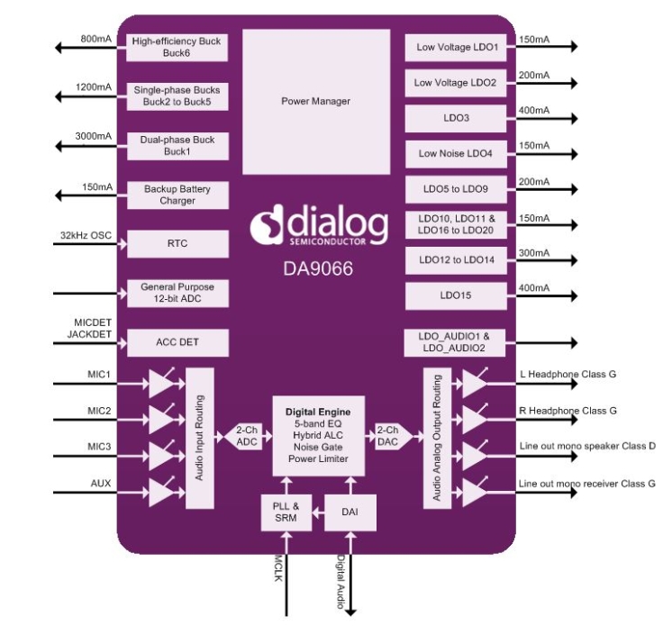 The DA9066 combines an ultra-low power audio codec with core power management functions targeting standalone application processors and mobile devices. The PMIC features single-phase, dual-phase and RF buck converters. High efficiency is achieved over a wide load range. All power switches are integrated and a high switching frequency allows low profile inductors to be used.