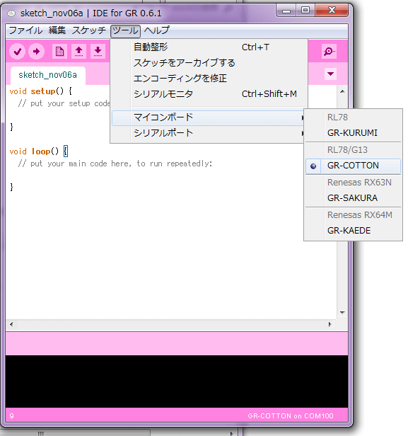 メニュー[ツール]→[マイコンボード]→[GR-COTTON]を選択します。