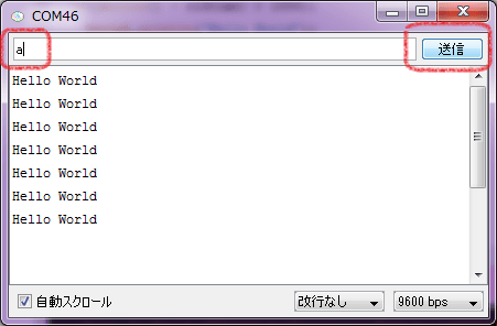 シリアルモニターが表示され、"Hello World"が出力されると思います。ここで上のエントリーに"a"を入力して送信ボタンを押してみましょう。