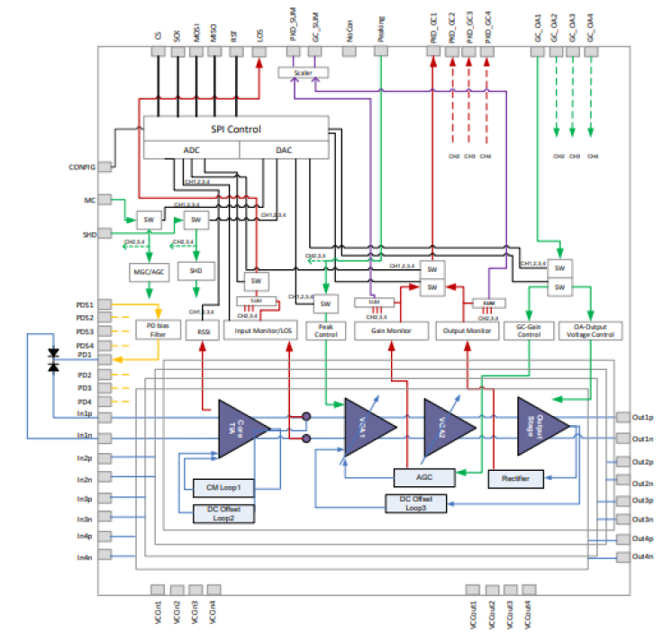 - Quad 32Gbps linear TIA Integrated SPI and analog interface