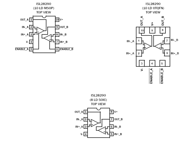 The ISL28290 is a dual ultra-low noise, ultra-low distortion operational amplifier that is fully specified to operate down to +3V single supply. The amplifier has outputs that swing rail-to-rail, and an input common mode voltage that extends below ground (ground sensing). The ISL28290 is unity gain stable with an input referred voltage noise of 1nV/√Hz. The part features 0.00017% THD+N at 1kHz. The ISL28290 is available in 10-lead UTQFN (1.8mm x 1.4mm), 10-lead MSOP, and 8-lead SOIC packages. Device operation is guaranteed over -40 °C to +125 °C.