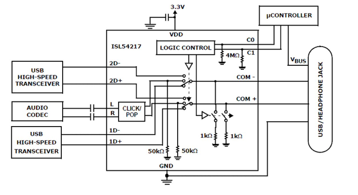 The ISL54217 is a single supply dual SP3T analog switch that operates from a single supply in the range of 2.7V to 4.6V. It was designed to multiplex between audio stereo signals and two different USB 2.0 High-Speed differential data signals. The audio channels allow signal swings below ground, allowing the multiplexing of voice and data signals through a common headphone connector in personal media players and other portable battery-powered devices. The audio switch cells can pass ±1V ground referenced audio signals with very low distortion (<0.03% THD+N when driving 5mW into 32Ω loads). The USB switch cells have very low ON-capacitance (8pF) and high bandwidth to pass USB High-Speed signals (480Mbps) with minimal edge and phase distortion. The ISL54217 is available in a tiny 12 Ld 2.2mm x 1.4mm ultra-thin QFN and a 12 Ld 3mm x 3mm TQFN package. It operates over a temperature range of -40 °C to +85 °C.