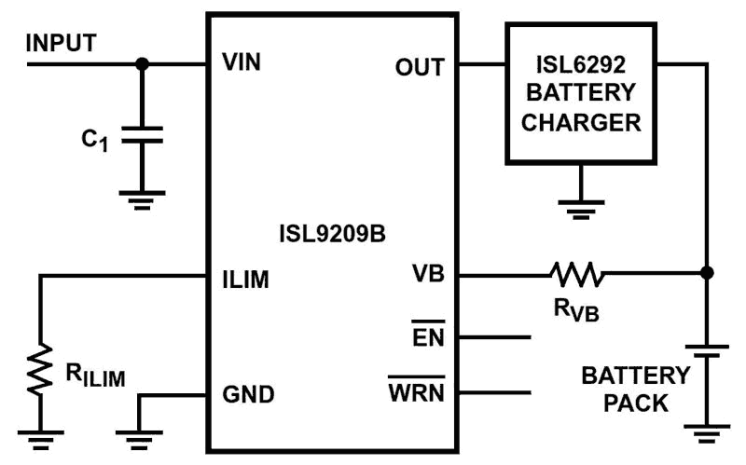 The ISL9209B is an integrated circuit (IC) optimized to provide a redundant safety protection to a Li-ion battery from failures of a charging system. The IC monitors the input voltage, the battery voltage and the charge current. When any of the three parameters exceeds its limit, the IC turns off an internal P-Channel MOSFET to remove the power from the charging system. In addition to the above protected parameters, the IC also monitors its own internal temperature and turns off the P-Channel MOSFET when the temperature exceeds +140°C. Together with the battery charger IC and the protection module in a battery pack, the charging system using the ISL9209B has triple-level protection and is two-fault tolerant. The IC is designed to turn on the internal PFET slowly to avoid inrush current at power up but will turn off the PFET quickly when the input is overvoltage in order to remove the power before any damage occurs. The ISL9209B has a logic warning output to indicate the fault and an enable input to allow the system to remove the input power.