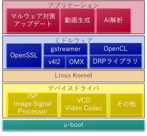 - ブートローダー、Linuxカーネル、デバイスドライバ、ミドルウェア、アプリケーションの作成