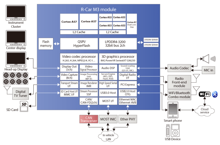 R-Car M3eは、車載インフォテインメント、ローエンド統合コックピット、コネクテッドゲートウェイ、セントラルサーバーなど、ミドルクラスのコンピューティングを必要とする幅広い自動車アプリケーションで使用できます。2GHzバージョン(M3e-2G)も利用可能で、CPUパワーが向上します。