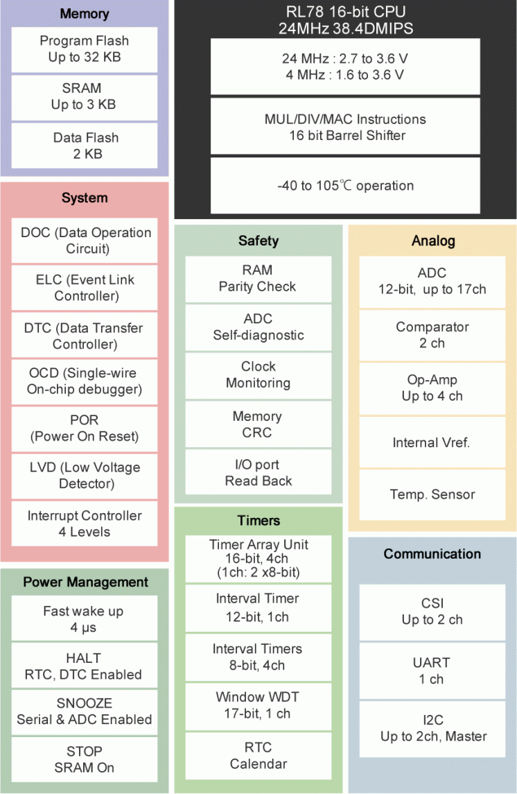 - CPU:RL78コア、最大24MHz