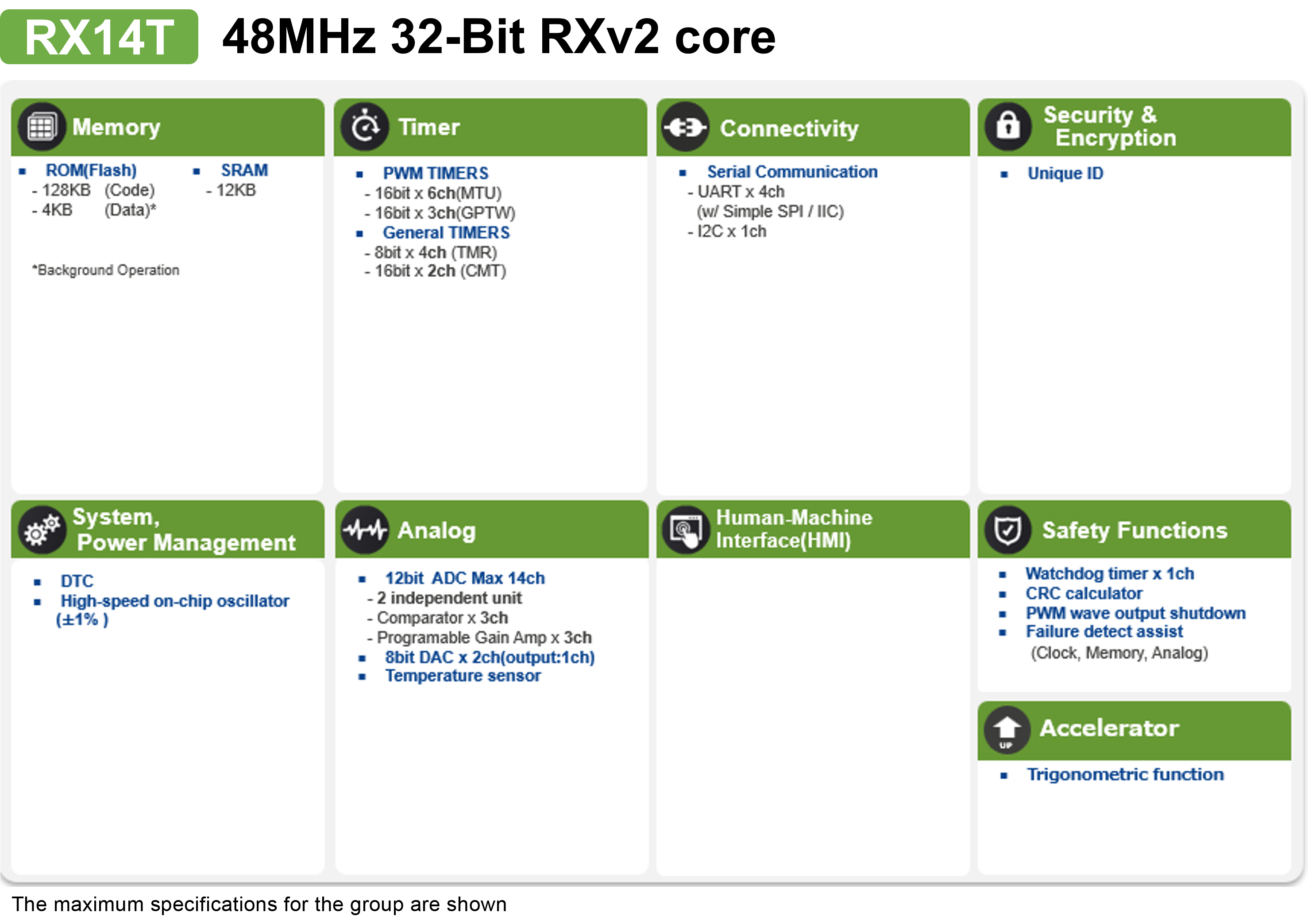 - 48MHz RXv2コア(5.05 CoreMark/MHz)、単精度FPU搭載