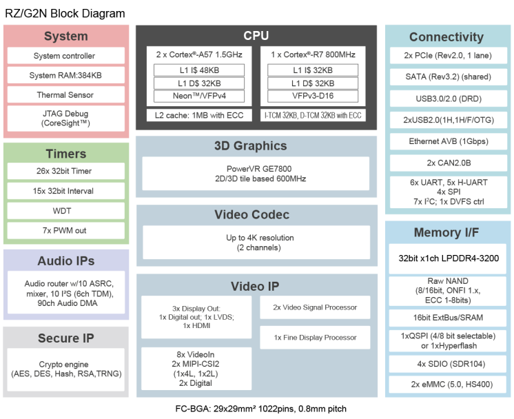 RZ/G2NマイクロプロセッサはDual Cortex®-A57(1.5GHz)CPU、32ビットLPDDR4 インタフェースを1チャネル備え、3Dグラフィックスエンジンに PowerVR GE7800@600MHz、 4Kビデオのエンコードとデコードを内蔵。USB 3.0、PCI Express、SATAおよびGbit-Etherなどの高速インタフェースと多くのCPU周辺機能も備えており、産業用途のヒューマンマシンインタフェース(HMI)などのアプリケーションに最適です。