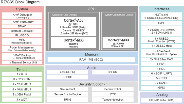 | Main CPU | Cortex-A55 x 1 + Cortex-M33 x 1, Cortex-A55 x 1 + Cortex-M33 x 2 |