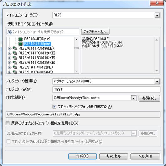 最初に、プロジェクトの作成を行います。メニューの「プロジェクト(P)」を選択し「新しいプロジェクトを作成(N)」をクリックします。すると下記のダイアログが表示されます。(図8)