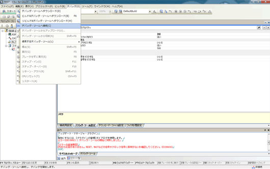 次に「CS+」のメニューから「デバッグ(D)」を選択し「デバッグ・ツールへ接続」をクリックしてください。選択して、数十秒待つと接続されます(図11)。