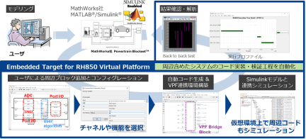 Embedded Target for RH850 Virtual Platform は、Simulink®モデルからターゲットデバイスの周辺コードを生成し、Simulinkと仮想環境にて連携検証 vHILS (Virtual Hardware In the Loop Simulation)を行える開発環境です。