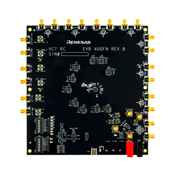 The RC31008A Evaluation Board (EVB) is designed to support users evaluating the RC31008A using clock generation in synthesizer mode for PCIe Gen 1-6 compliance or in jitter attenuation mode. When the EVB is connected via USB to the user’s computer running Renesas Integrated Circuit Toolbox (RICBox™) Software, the RC31008A can be configured in various frequencies with best-in-class performance. The RC31008A offers various features with total 8 pairs of differential outputs. Each pair of output can be programmed to LVCMOS style, LVDS style, and LP-HCSL style outputs. There are 5 general purpose input/output (GPIOs) and 4 general purpose input (GPIs) to support output enables, power down, configuration selection, and status outputs. Voltage levels for VDDX, VDDR, VDDA, VDDD, VDDO1, VDDO2, VDDO3, VDDO4, VDDO5, and VDDO6 can be set by jumper. The EVB kit also has a socket to load a configuration from EEPROM.