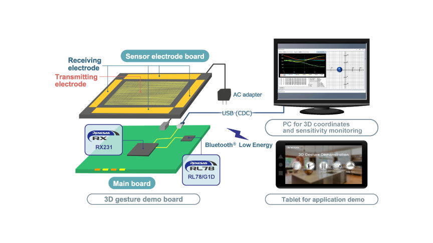 The 3D Gesture reference design is a solution that can detect the position (x, y, and z coordinates) of a hand in space using Renesas' capacitive touch sensing (CTSU) solution. The position of a hand up to 200mm above a panel surface is converted to x, y, and z coordinates. Moreover, since sensing of coordinate data can be carried out at high speed, gestures (up and down, right and left, and front and behind) and simple pattern recognition can be used to operate a device.